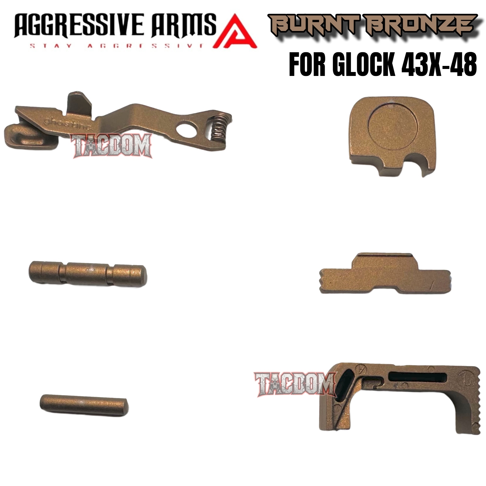 AGGRESSIVE ARMS BURNT BRONZE CERAKOTED PARTS FOR GLOCK 43X / 48 – GHOST EXTENDED SLIDE RELEASE / CATCH – SLIDE LOCK – PINS – REAR COVER PLATE – MAGAZINE CATCH