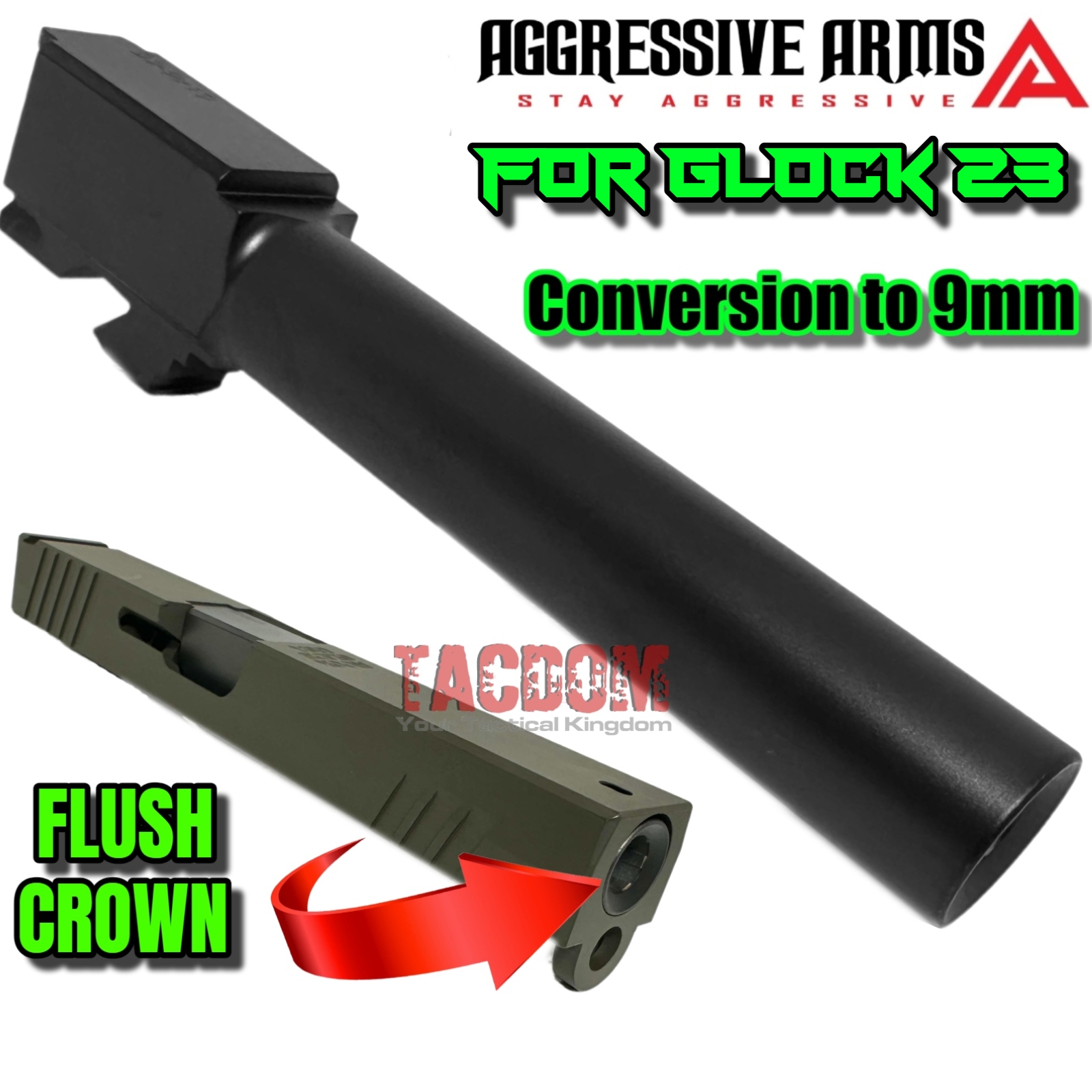AGGRESSIVE ARMS FLUSH CROWN 9mm CONVERSION BARREL for GLOCK 23 GEN 1 2 3 4 – BLACK DLC Finish – Stainless Steel