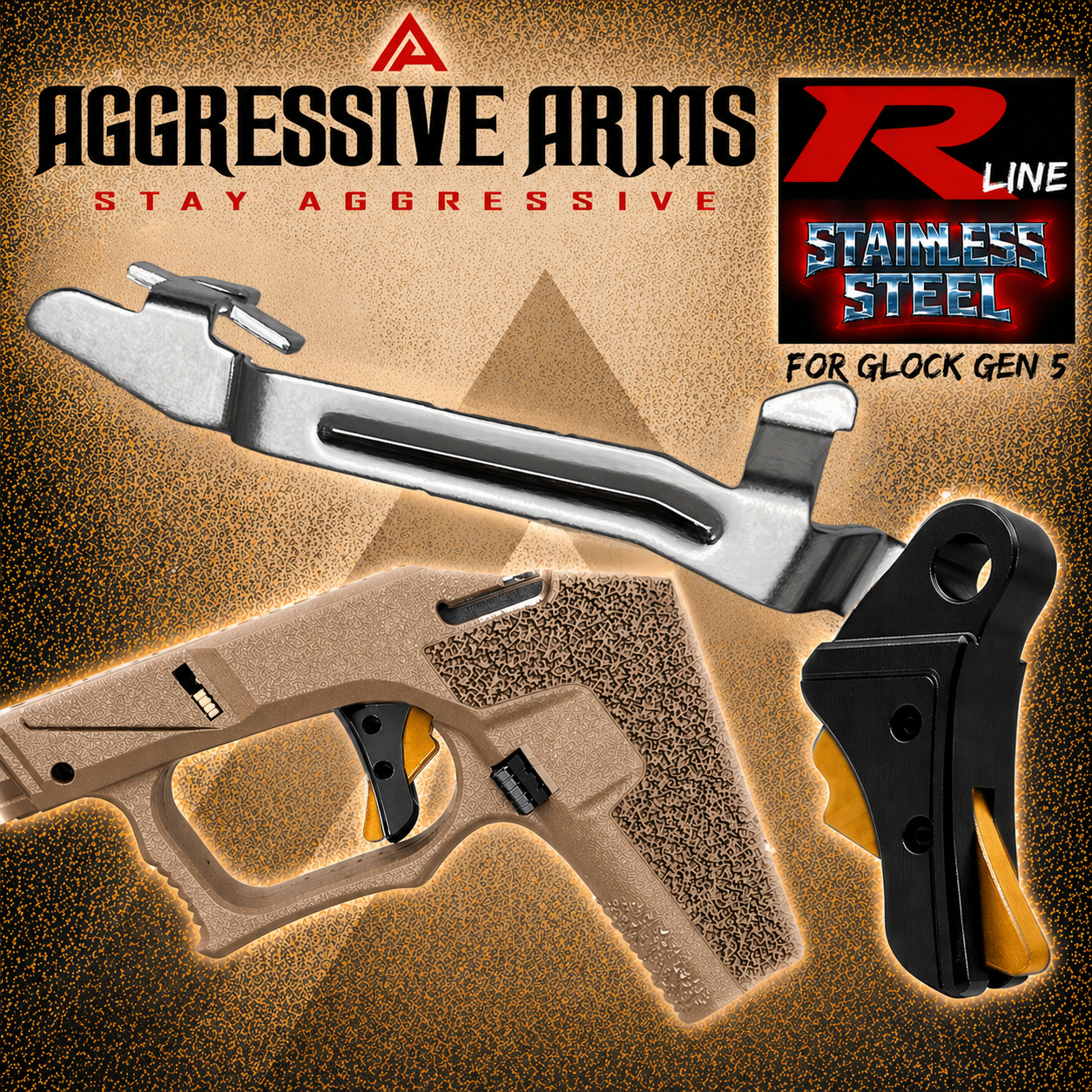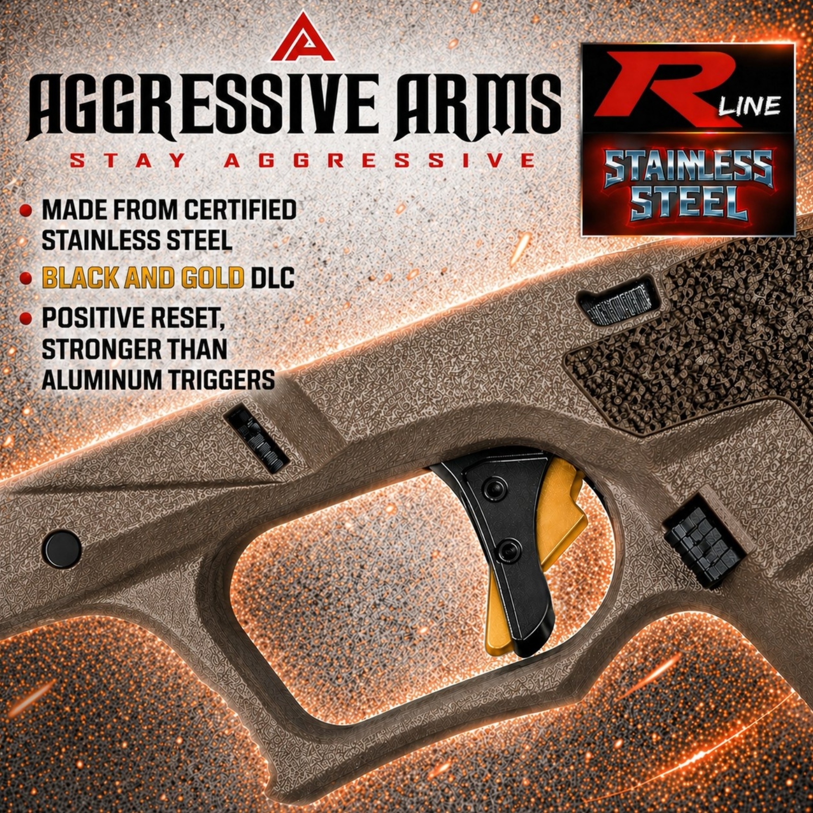 AGGRESSIVE ARMS R-LINE V2 for GLOCK GEN 5 “STAINLESS STEEL” TRIGGER BLACK DLC with GOLD SAFETY – With POLISHED TRIGGER BAR – 17 18 19 19X 22 23 26 27 31 32 33 34 35 45