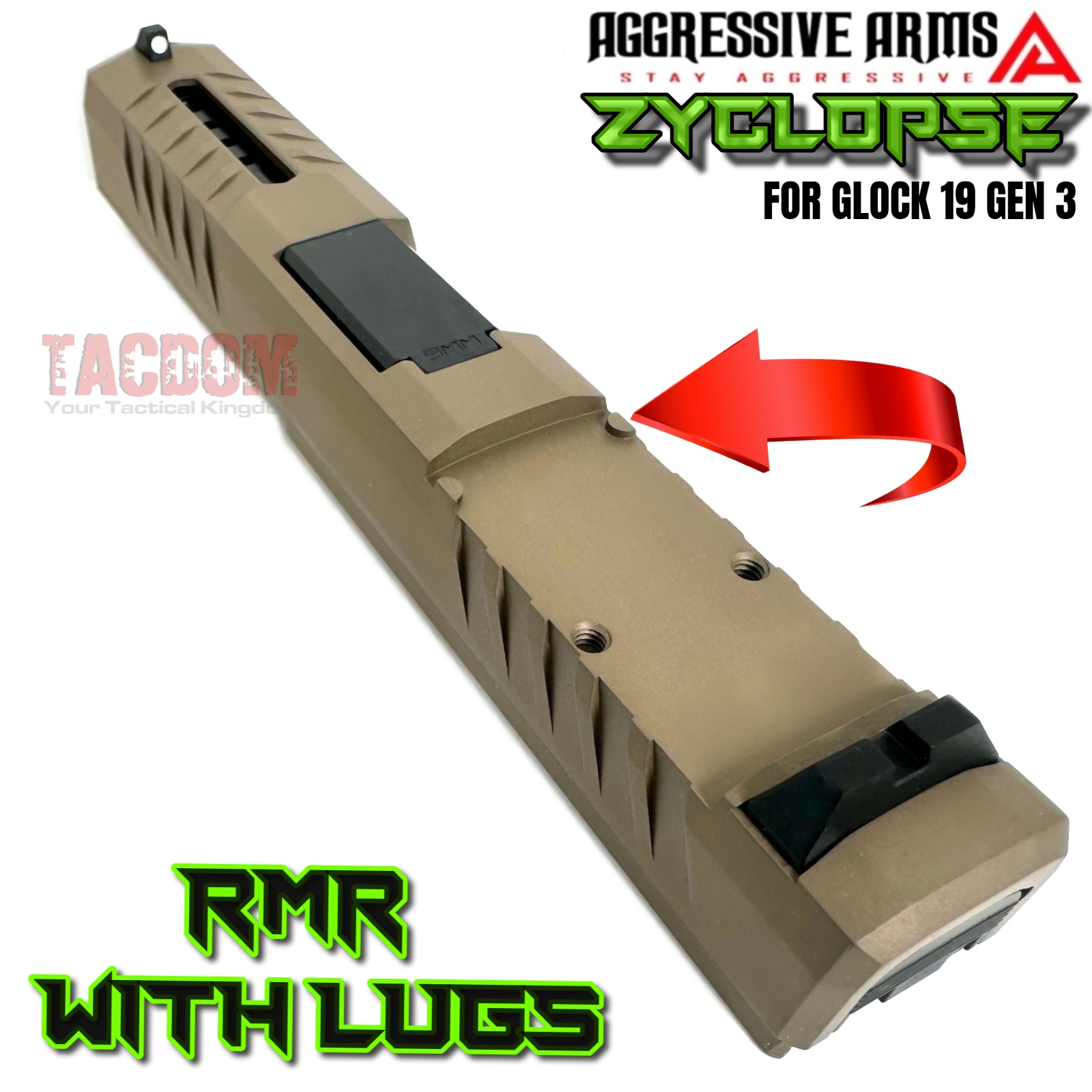 AGGRESSIVE ARMS ZYCLOPSE CENTRAL QUAD PORT SLIDE AND BARREL COMPLETE WITH PARTS INSTALLED FOR GLOCK 19 GEN 3 – FDE VAPOR