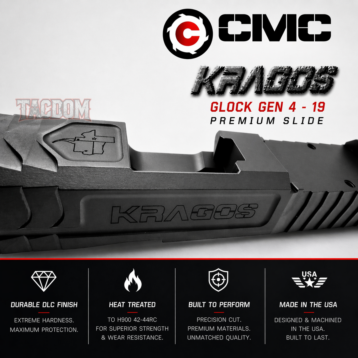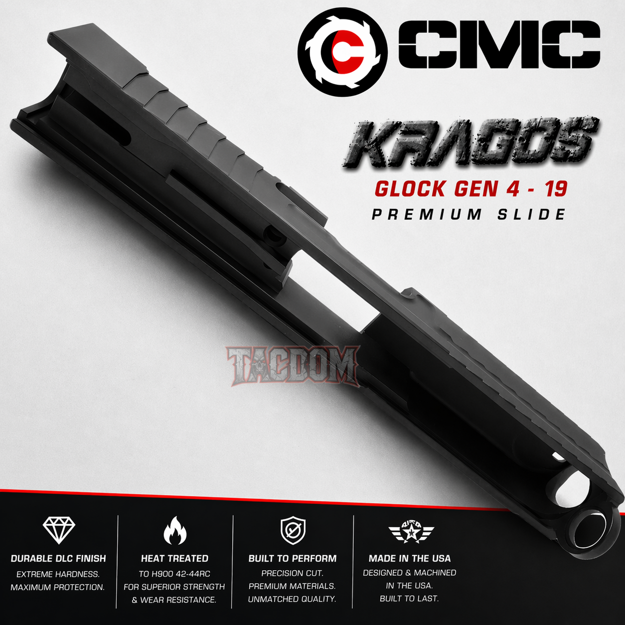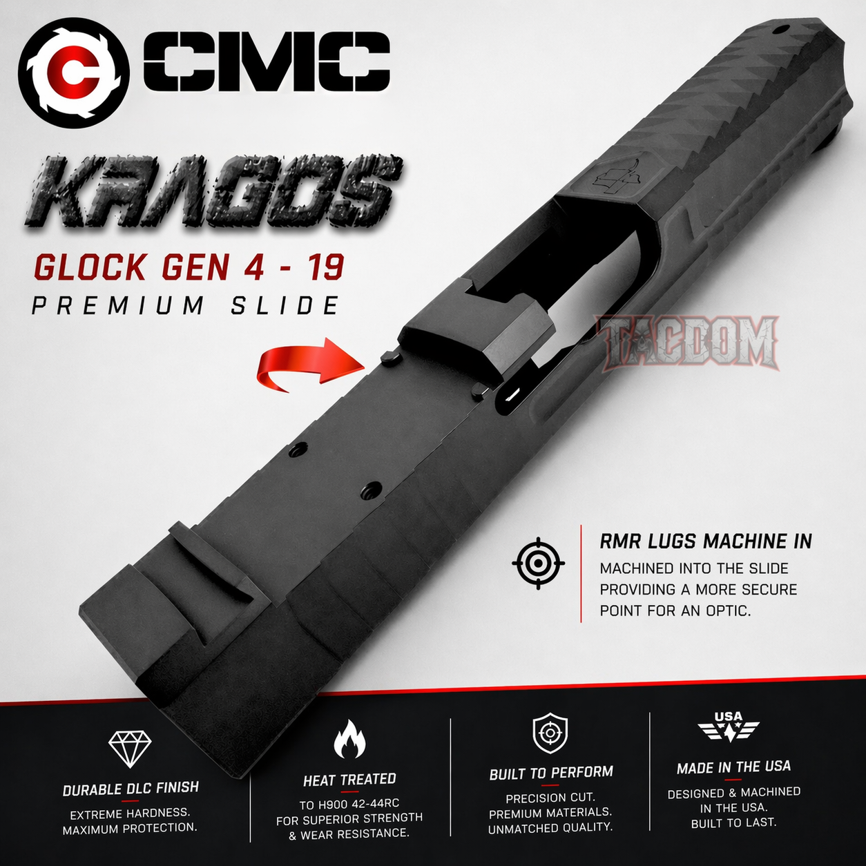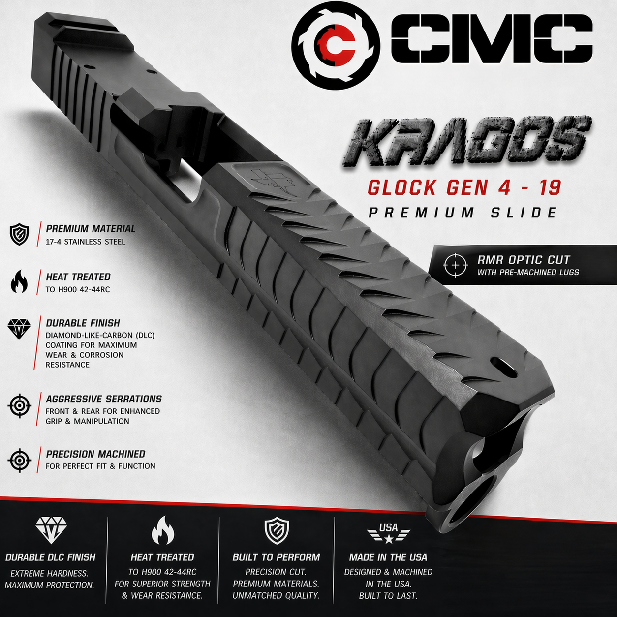 CMC KRAGOS SLIDE FOR GLOCK 19 GEN 4 – 17-4 BILLET STAINLESS – RMR CUT WITH MACHINED IN LUGS