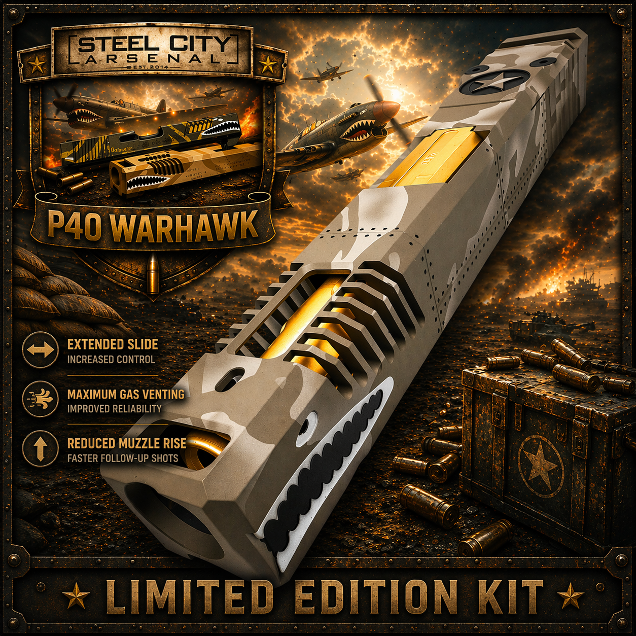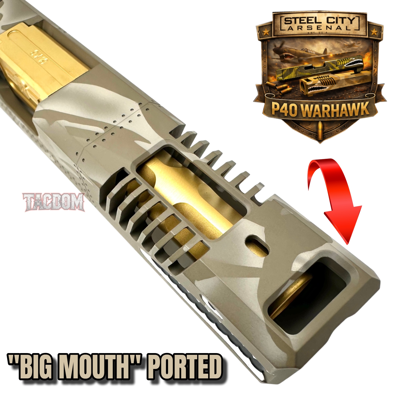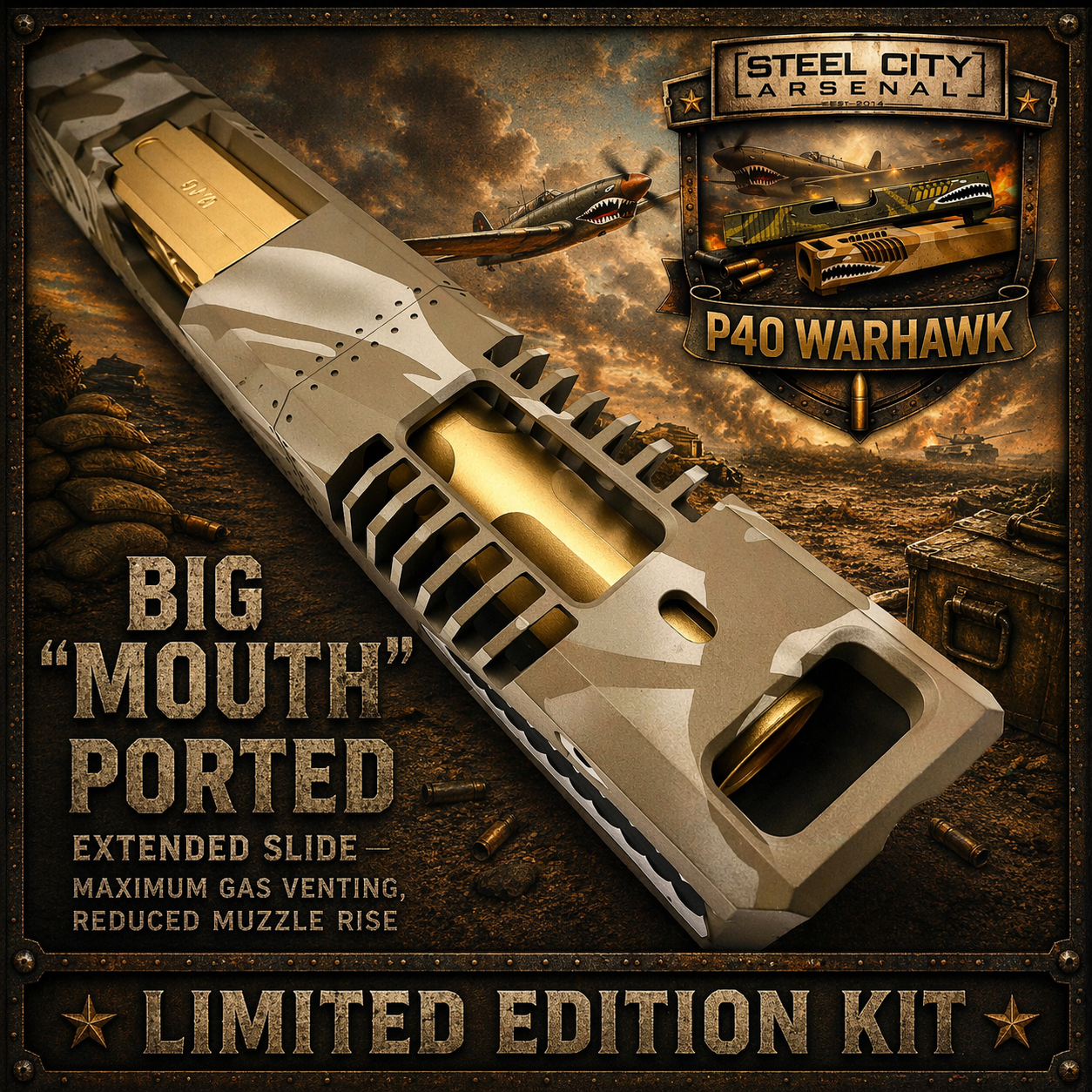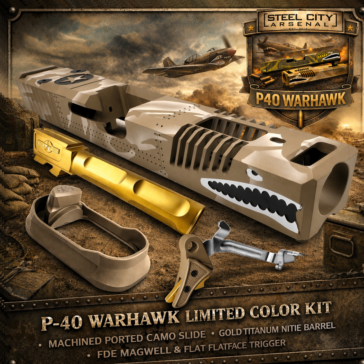 STEEL CITY ARSENAL LIMITED EDITION COLOR KIT – SHADOW TAN CAMO – P40 WARHAWK “EXTENDED + PORTED” SLIDE for GLOCK 19 GEN 3 – COLOR FILL SNARL – GOLD P40 BARREL – FDE / GOLD TRIGGER – BILLET ALUMINUM FDE MAGWELL