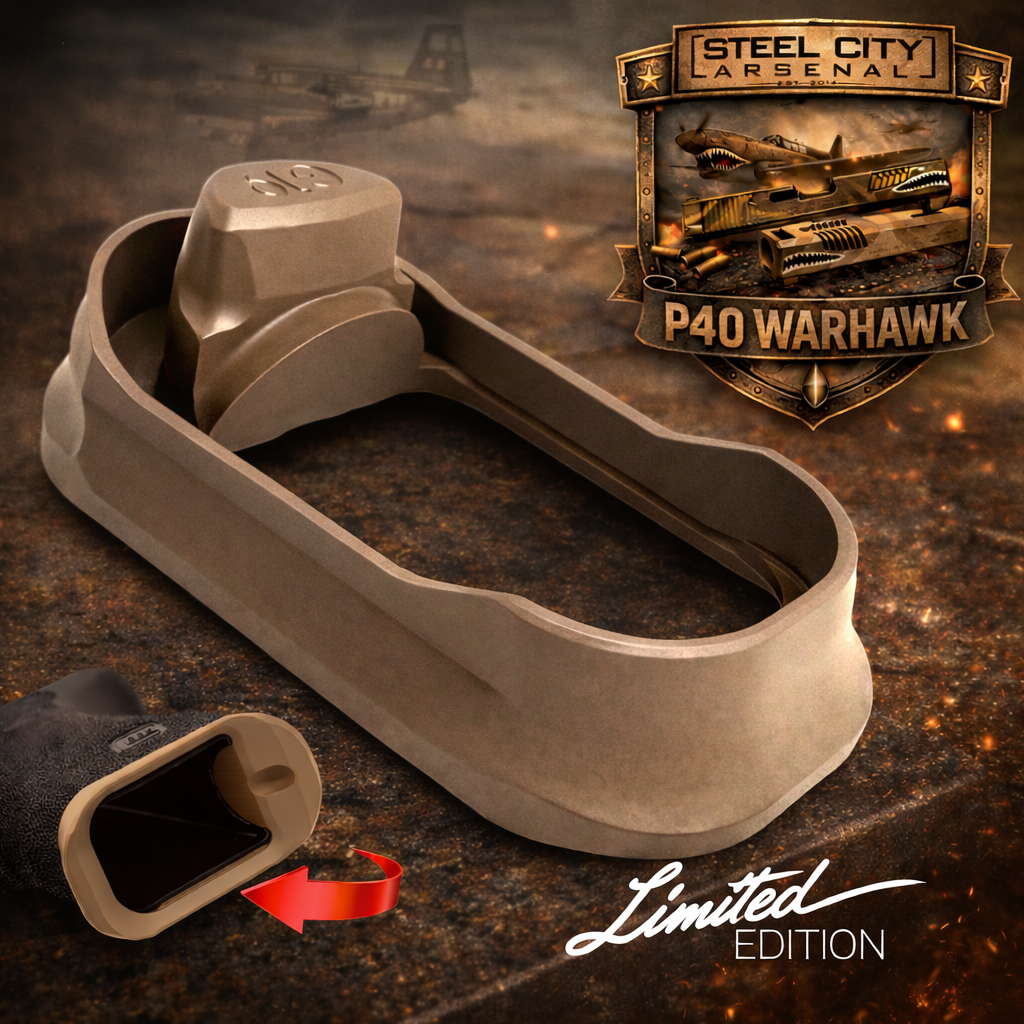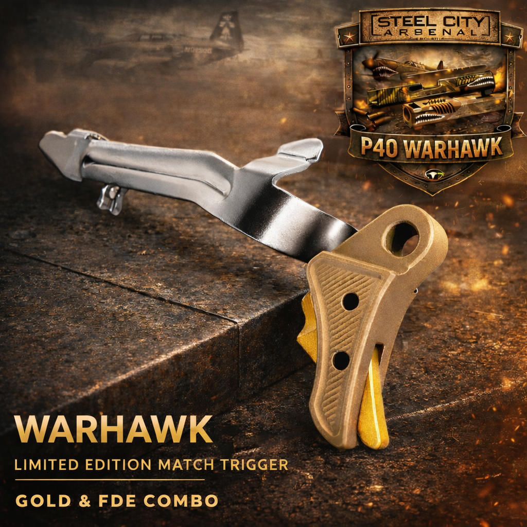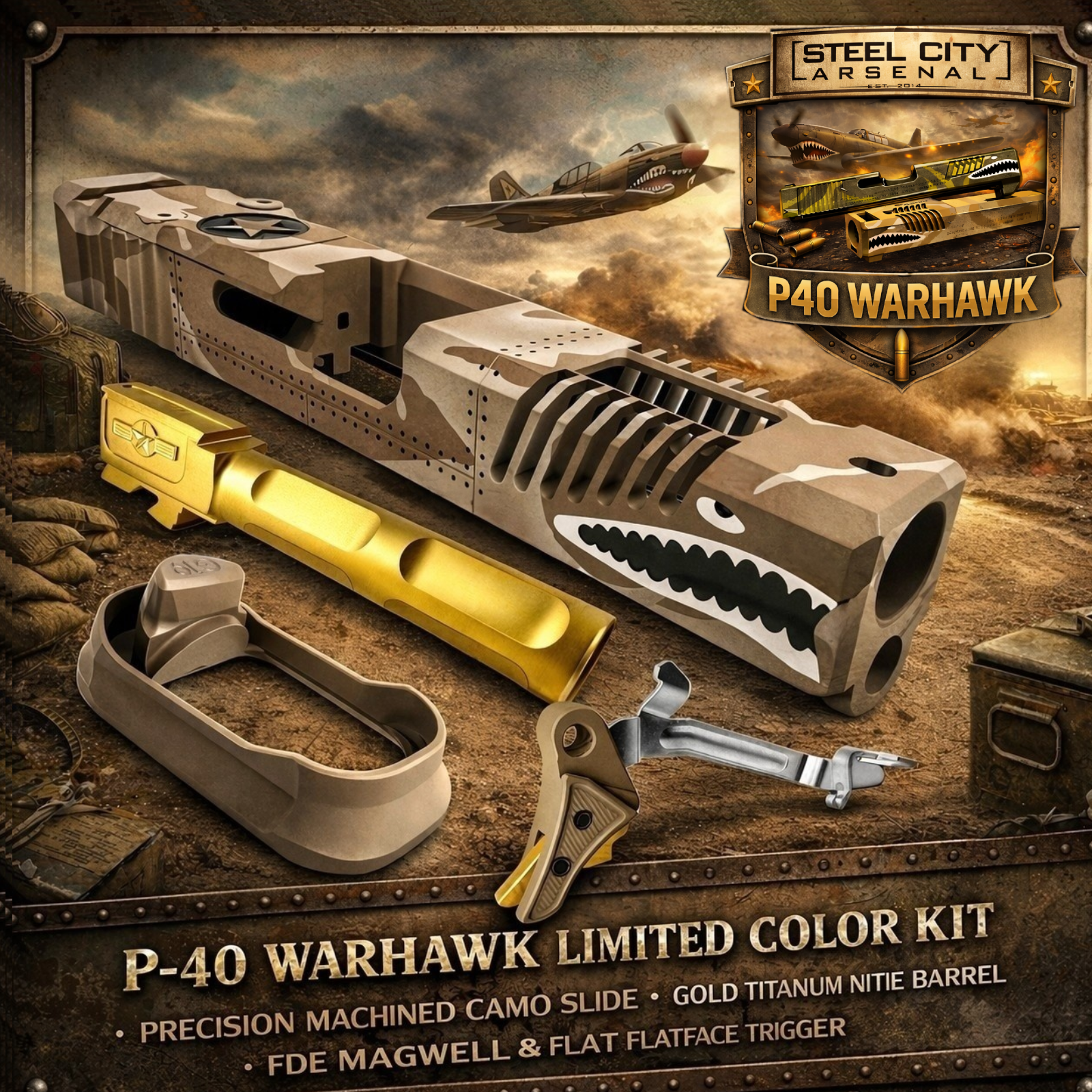 STEEL CITY ARSENAL LIMITED EDITION COLOR KIT – SHADOW TAN CAMO – P40 WARHAWK SLIDE for GLOCK 19 GEN 3 – COLOR FILL SNARL – GOLD P40 BARREL – FDE / GOLD TRIGGER – BILLET ALUMINUM FDE MAGWELL