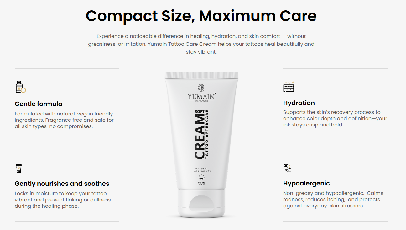 Yumain Tattoo Cream is the ultimate tattoo aftercare solution, specially formulated for sensitive and all skin types. This fast-absorbing, non-greasy cream provides deep hydration, helping to prevent dryness, irritation, and flaking while maintaining the vibrancy of your ink.