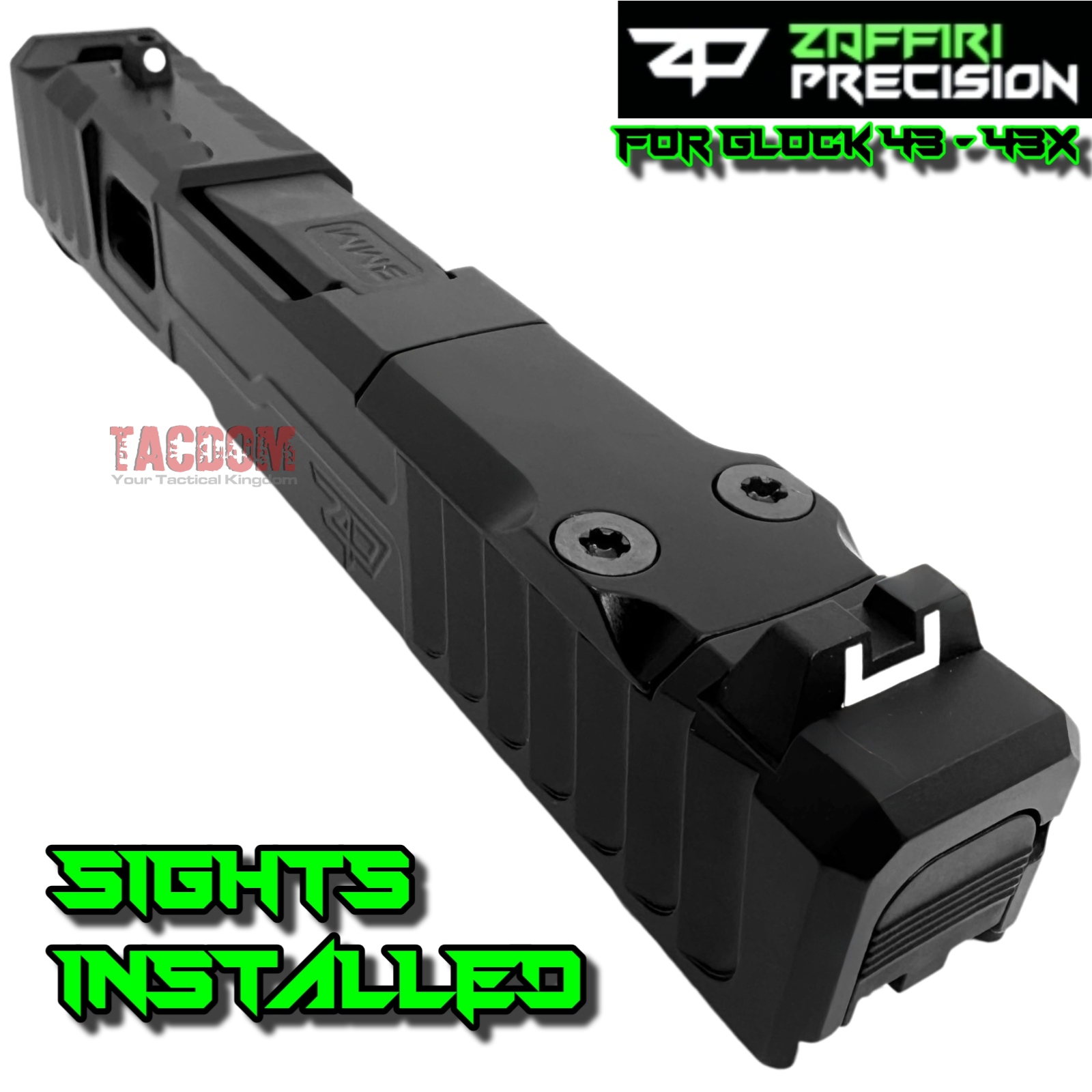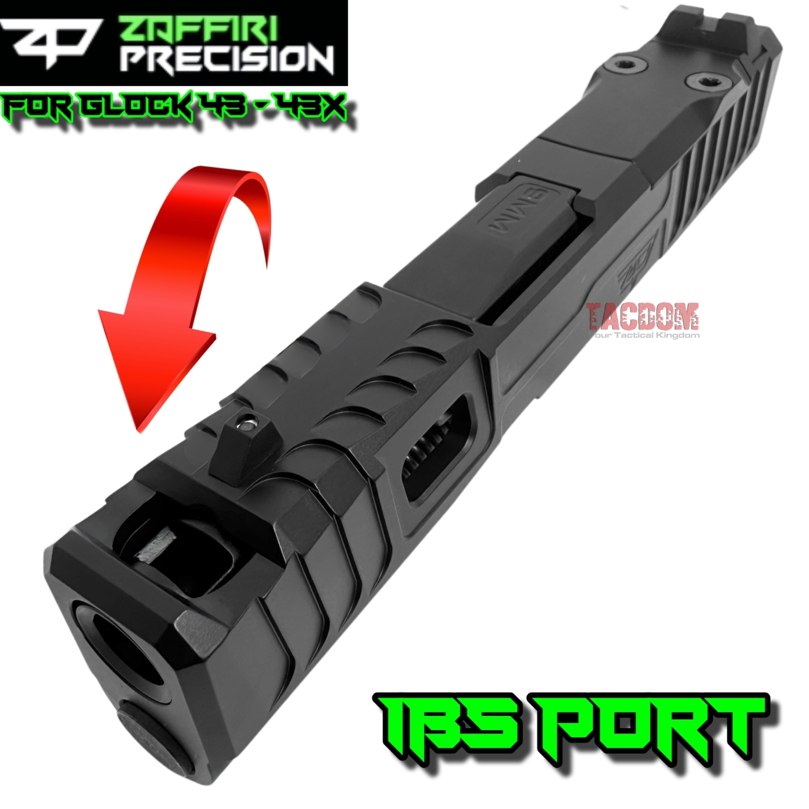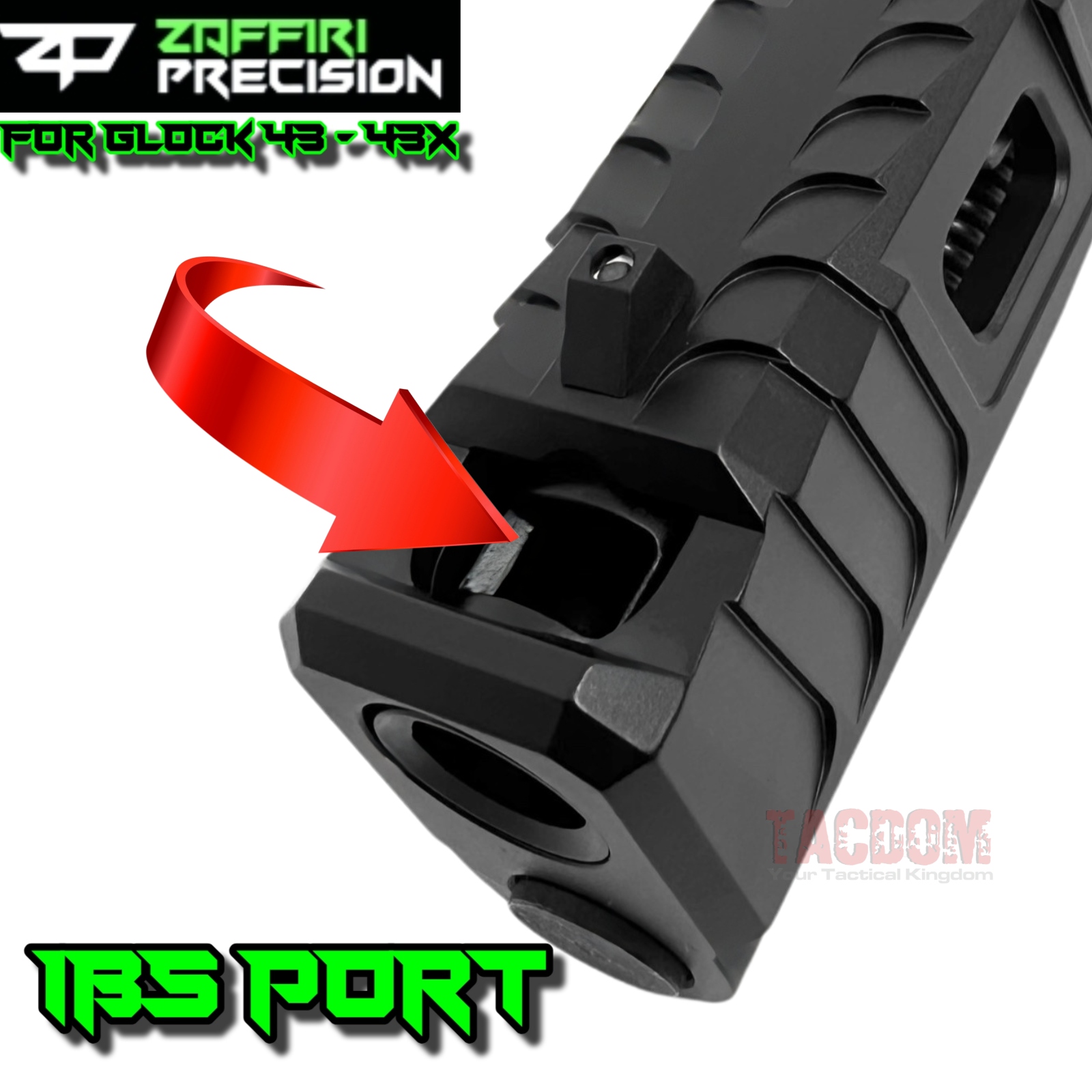 ZAFFIRI BLACK COMPLETE IBS PORTED SLIDE WITH IBS BARREL – GLOCK OEM WHITE DOT SIGHTS – UPK INSTALLED – RMSC COVER PLATE FOR GLOCK 43 / 43X