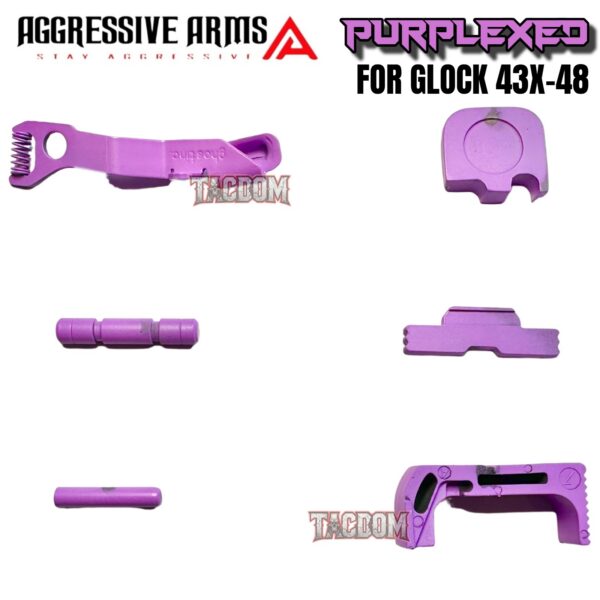 AGGRESSIVE ARMS PURPLEXED CERAKOTED PARTS FOR GLOCK 43X / 48 – GHOST EXTENDED SLIDE RELEASE / CATCH – SLIDE LOCK – PINS – REAR COVER PLATE – MAGAZINE CATCH